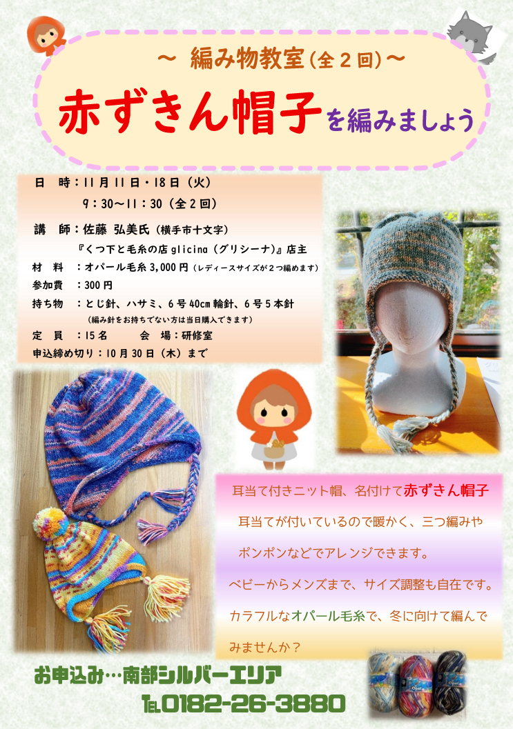 【編み物教室】赤ずきん帽子を編みましょう(全2回)